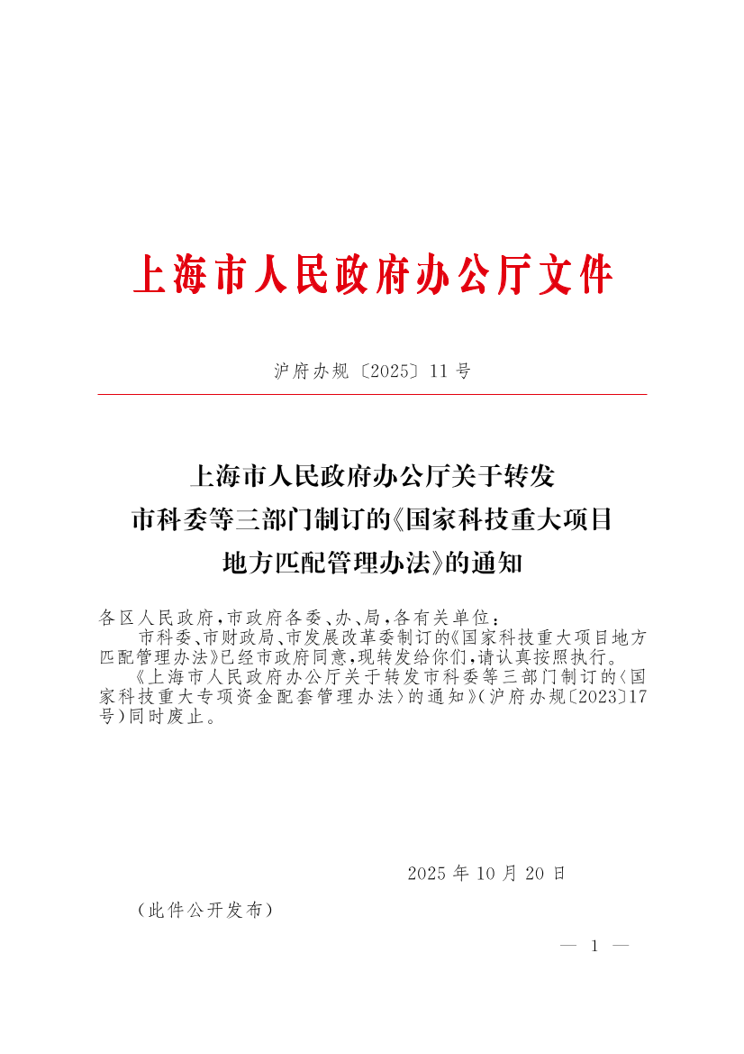 上海市人民政府辦公廳關于轉(zhuǎn)發(fā)市科委等三部門制訂的《國家科技重大項目地方匹配管理辦法》的通知