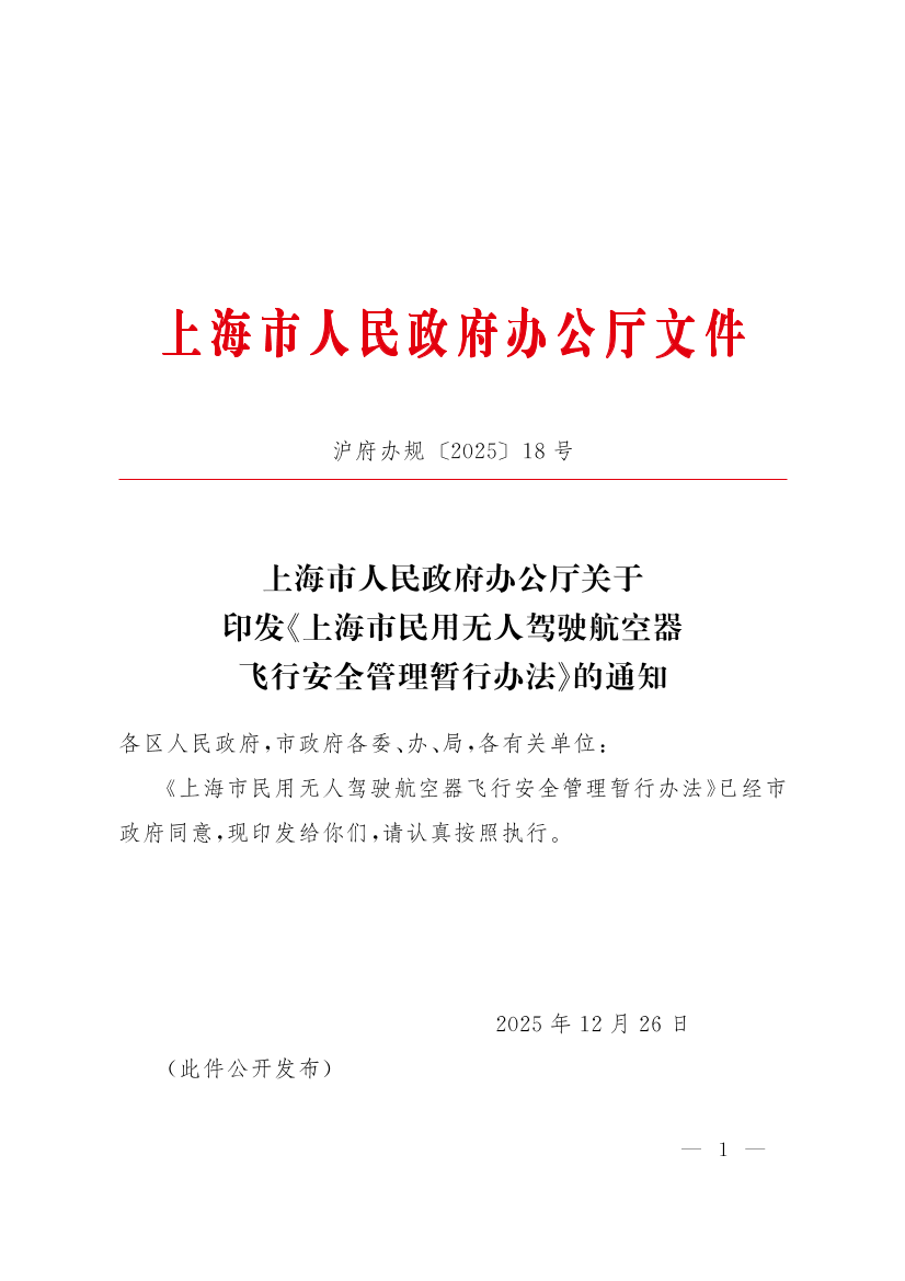 上海市人民政府辦公廳關(guān)于印發(fā)《上海市民用無人駕駛航空器飛行安全管理暫行辦法》的通知