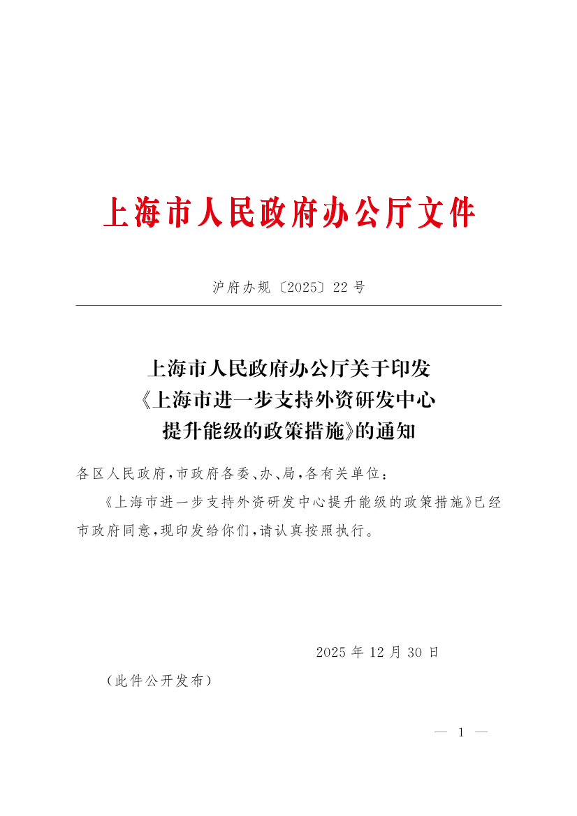 上海市人民政府辦公廳關(guān)于印發(fā)《上海市進(jìn)一步支持外資研發(fā)中心提升能級(jí)的政策措施》的通知