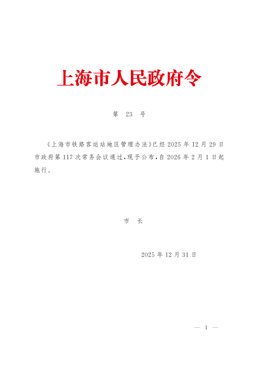 ??《上海市鐵路客運(yùn)站地區(qū)管理辦法》已經(jīng)2025年12月29日市政府第117次常務(wù)會(huì)議通過(guò),現(xiàn)予公布,自2026年2月1日起施行。