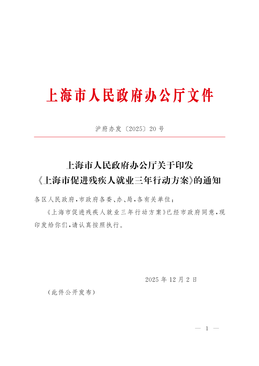 上海市人民政府辦公廳關(guān)于印發(fā)《上海市促進殘疾人就業(yè)三年行動方案》的通知