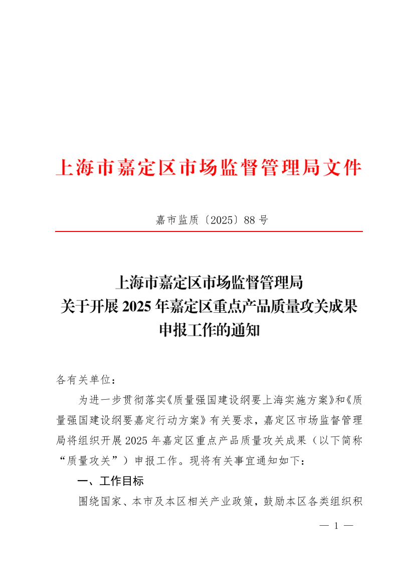 ??為進(jìn)一步貫徹落實(shí)《質(zhì)量強(qiáng)國建設(shè)綱要上海實(shí)施方案》和《質(zhì)量強(qiáng)國建設(shè)綱要嘉定行動(dòng)方案》有關(guān)要求,嘉定區(qū)市場(chǎng)監(jiān)督管理局將組織開展2025年嘉定區(qū)重點(diǎn)產(chǎn)品質(zhì)量攻關(guān)成果(以下簡(jiǎn)稱“質(zhì)量攻關(guān)”)申報(bào)工作?,F(xiàn)將有關(guān)事宜通知如下: