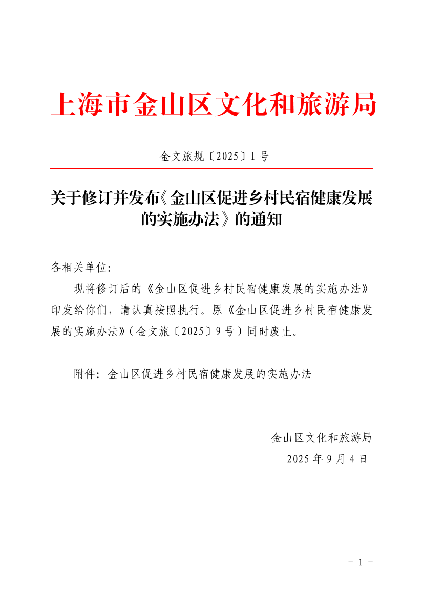 ??現(xiàn)將修訂后的《金山區(qū)促進鄉(xiāng)村民宿健康發(fā)展的實施辦法》印發(fā)給你們,請認真按照執(zhí)行。原《金山區(qū)促進鄉(xiāng)村民宿健康發(fā)展的實施辦法》(金文旅〔2025〕9號)同時廢止。