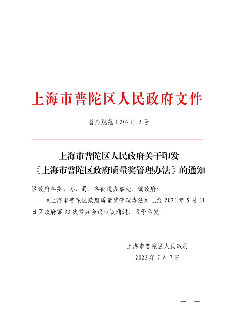 ??《上海市普陀區(qū)政府質(zhì)量獎管理辦法》已經(jīng)2023年5月31日區(qū)政府第33次常務會議審議通過,現(xiàn)予印發(fā)。