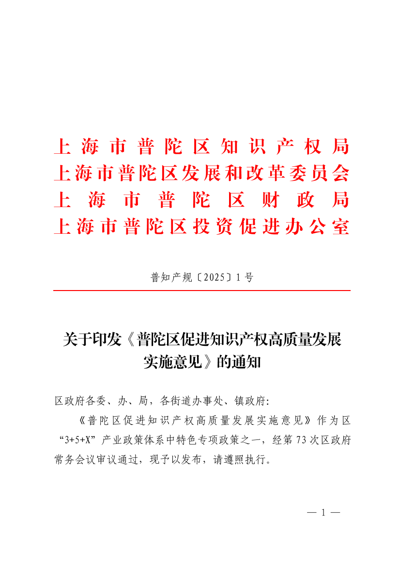 ??《普陀區(qū)促進(jìn)知識(shí)產(chǎn)權(quán)高質(zhì)量發(fā)展實(shí)施意見(jiàn)》作為區(qū)“3+5+X”產(chǎn)業(yè)政策體系中特色專項(xiàng)政策之一,經(jīng)第73次區(qū)政府常務(wù)會(huì)議審議通過(guò),現(xiàn)予以發(fā)布,請(qǐng)遵照?qǐng)?zhí)行。