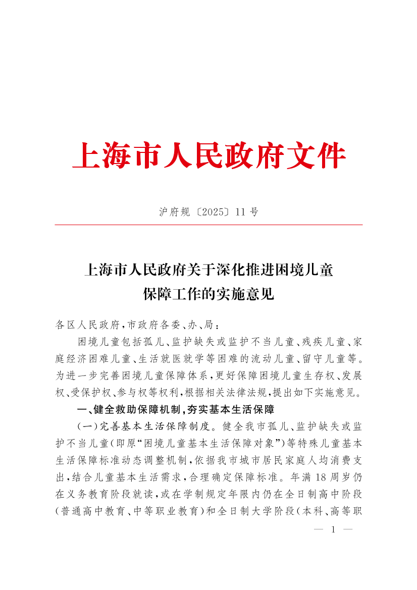 ??本意見(jiàn)自2026年1月1日起施行,有效期至2030年12月31日?!渡虾J腥嗣裾P(guān)于深化推進(jìn)本市困境兒童保障工作的實(shí)施意見(jiàn)》(滬府規(guī)〔2022〕4號(hào))同步廢止。