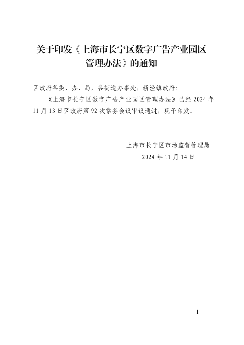 ??《上海市長寧區(qū)數(shù)字廣告產(chǎn)業(yè)園區(qū)管理辦法》已經(jīng)2024年11月13日區(qū)政府第92次常務(wù)會議審議通過,現(xiàn)予印發(fā)。