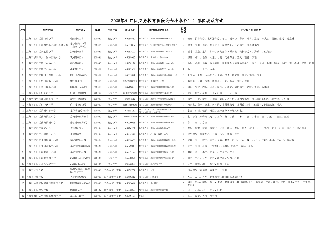 2025年虹口區(qū)義務(wù)教育階段公辦小學(xué)招生計劃和聯(lián)系方式