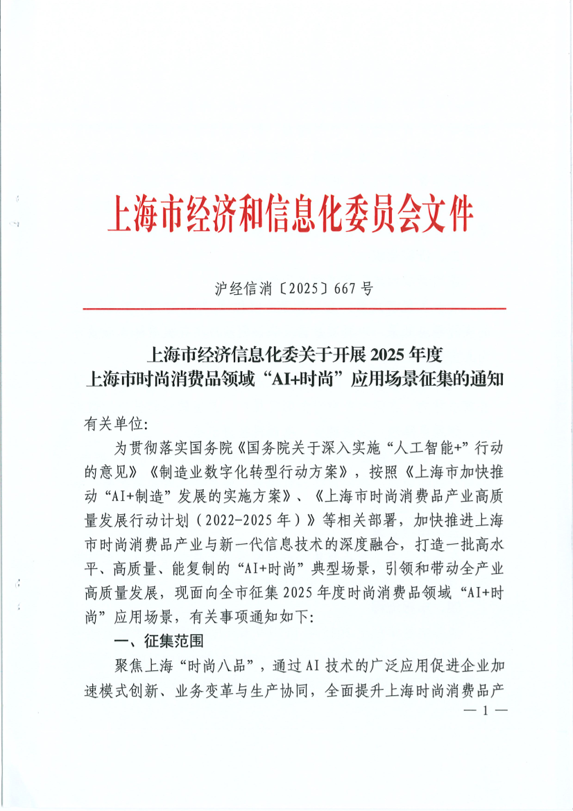??為貫徹落實(shí)國(guó)務(wù)院《國(guó)務(wù)院關(guān)于深入實(shí)施“人工智能+”行動(dòng)的意見》《制造業(yè)數(shù)字化轉(zhuǎn)型行動(dòng)方案》,按照《上海市加快推動(dòng)“AI+制造”發(fā)展的實(shí)施方案》、《上海市時(shí)尚消費(fèi)品產(chǎn)業(yè)高質(zhì)量發(fā)展行動(dòng)計(jì)劃(2022-2025年)》等相關(guān)部署,加快推進(jìn)上海市時(shí)尚消費(fèi)品產(chǎn)業(yè)與新一代信息技術(shù)的深度融合,打造一批高水平、高質(zhì)量、能復(fù)制的“AI+時(shí)尚”典型場(chǎng)景,引領(lǐng)和帶動(dòng)全產(chǎn)業(yè)高質(zhì)量發(fā)展,現(xiàn)面向全市征集2025年度時(shí)尚消費(fèi)品領(lǐng)域“AI+時(shí)尚”應(yīng)用場(chǎng)景,有關(guān)事項(xiàng)通知如下: