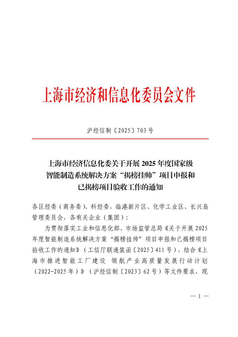 ??為貫徹落實(shí)工業(yè)和信息化部、市場(chǎng)監(jiān)管總局《關(guān)于開展2025年度智能制造系統(tǒng)解決方案“揭榜掛帥”項(xiàng)目申報(bào)和已揭榜項(xiàng)目驗(yàn)收工作的通知》(工信廳聯(lián)通裝函〔2025〕411號(hào)),結(jié)合《上海市推進(jìn)智能工廠建設(shè) 領(lǐng)航產(chǎn)業(yè)高質(zhì)量發(fā)展行動(dòng)計(jì)劃(2022-2025年)》(滬經(jīng)信制〔2023〕62號(hào))等文件要求,現(xiàn)啟動(dòng)2025年度國(guó)家級(jí)智能制造系統(tǒng)解決方案“揭榜掛帥”項(xiàng)目申報(bào)和已揭榜項(xiàng)目驗(yàn)收工作,具體通知如下: