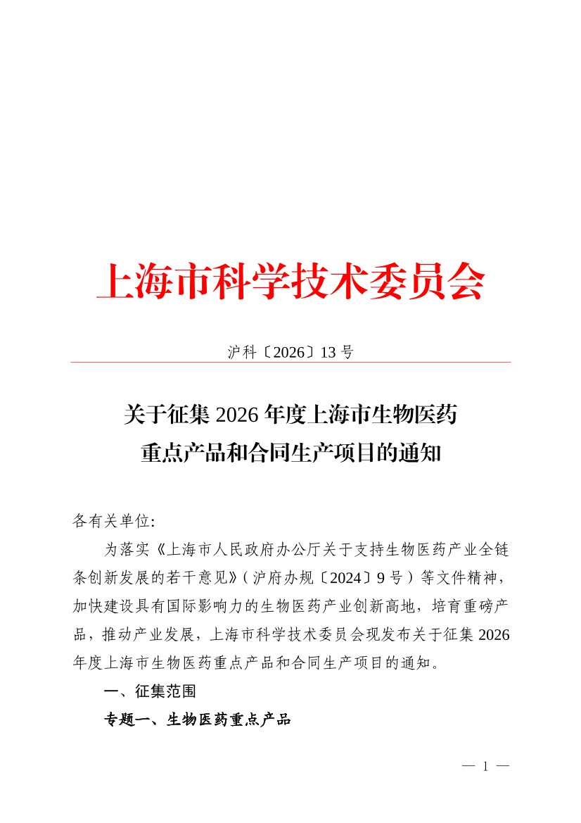 ??為落實《上海市人民政府辦公廳關(guān)于支持生物醫(yī)藥產(chǎn)業(yè)全鏈條創(chuàng)新發(fā)展的若干意見》(滬府辦規(guī)〔2024〕9號)等文件精神,加快建設(shè)具有國際影響力的生物醫(yī)藥產(chǎn)業(yè)創(chuàng)新高地,培育重磅產(chǎn)品,推動產(chǎn)業(yè)發(fā)展,上海市科學(xué)技術(shù)委員會現(xiàn)發(fā)布關(guān)于征集2026年度上海市生物醫(yī)藥重點產(chǎn)品和合同生產(chǎn)項目的通知。