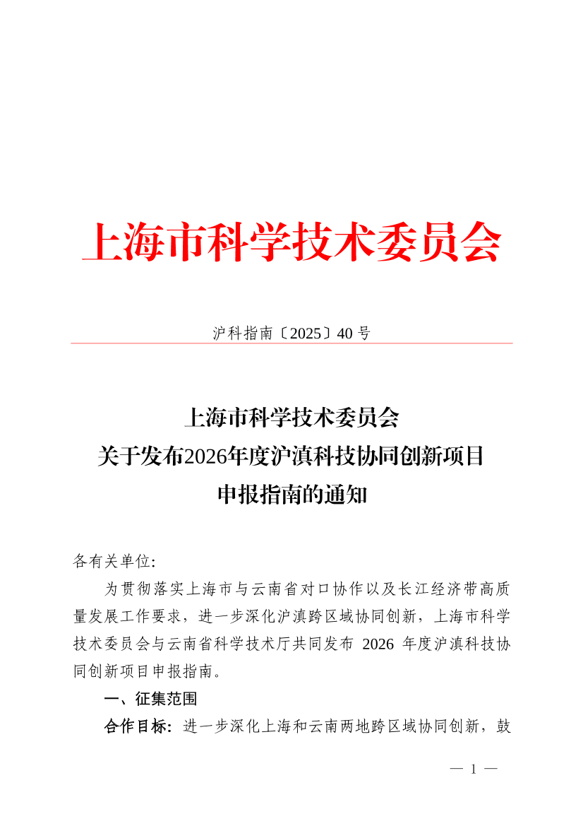 ??為貫徹落實上海市與云南省對口協(xié)作以及長江經(jīng)濟帶高質(zhì)量發(fā)展工作要求,進一步深化滬滇跨區(qū)域協(xié)同創(chuàng)新,上海市科學(xué)技術(shù)委員會與云南省科學(xué)技術(shù)廳共同發(fā)布2026年度滬滇科技協(xié)同創(chuàng)新項目申報指南。