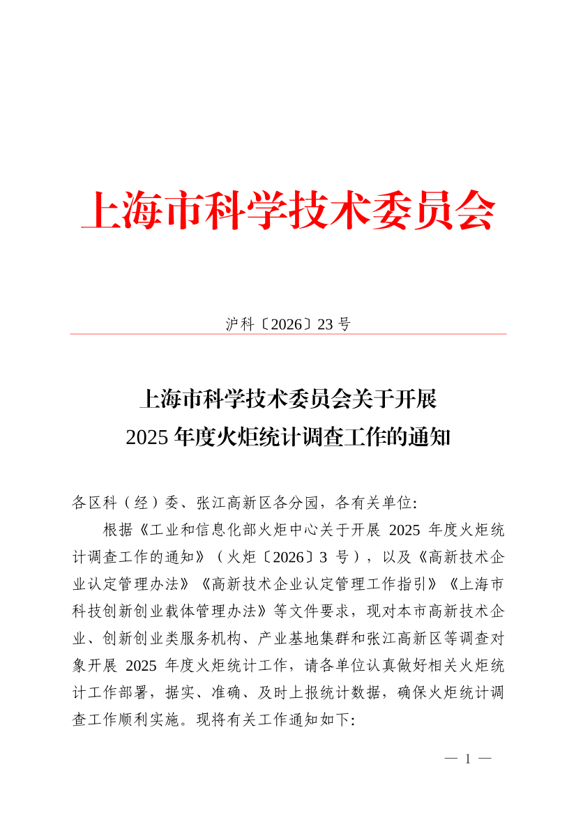 ??根據(jù)《工業(yè)和信息化部火炬中心關(guān)于開(kāi)展2025年度火炬統(tǒng)計(jì)調(diào)查工作的通知》(火炬〔2026〕3號(hào)),以及《高新技術(shù)企業(yè)認(rèn)定管理辦法》《高新技術(shù)企業(yè)認(rèn)定管理工作指引》《上海市科技創(chuàng)新創(chuàng)業(yè)載體管理辦法》等文件要求,現(xiàn)對(duì)本市高新技術(shù)企業(yè)、創(chuàng)新創(chuàng)業(yè)類服務(wù)機(jī)構(gòu)、產(chǎn)業(yè)基地集群和張江高新區(qū)等調(diào)查對(duì)象開(kāi)展2025年度火炬統(tǒng)計(jì)工作,請(qǐng)各單位認(rèn)真做好相關(guān)火炬統(tǒng)計(jì)工作部署,據(jù)實(shí)、準(zhǔn)確、及時(shí)上報(bào)統(tǒng)計(jì)數(shù)據(jù),確?;鹁娼y(tǒng)計(jì)調(diào)查工作順利實(shí)施。現(xiàn)將有關(guān)工作通知如下: