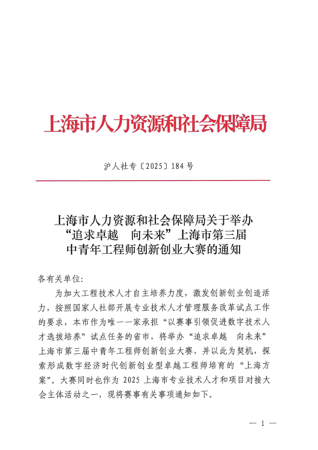 ??為加大工程技術(shù)人才自主培養(yǎng)力度,激發(fā)創(chuàng)新創(chuàng)業(yè)創(chuàng)造活力,按照國(guó)家人社部開(kāi)展專(zhuān)業(yè)技術(shù)人才管理服務(wù)改革試點(diǎn)工作的要求,本市作為唯一一家承擔(dān)“以賽事引領(lǐng)促進(jìn)數(shù)字技術(shù)人才選拔培養(yǎng)”試點(diǎn)任務(wù)的省市,將舉辦“追求卓越 向未來(lái)”上海市第三屆中青年工程師創(chuàng)新創(chuàng)業(yè)大賽,并以此為契機(jī),探索形成數(shù)字經(jīng)濟(jì)時(shí)代創(chuàng)新創(chuàng)業(yè)型卓越工程師培育的“上海方案”。大賽同時(shí)也作為2025上海市專(zhuān)業(yè)技術(shù)人才和項(xiàng)目對(duì)接大會(huì)主體活動(dòng)之一,現(xiàn)將賽事有關(guān)事項(xiàng)通知如下。