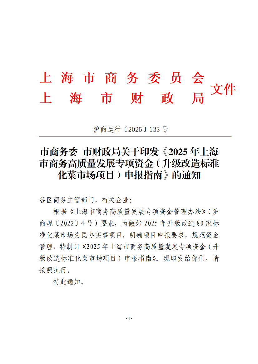 ??為進(jìn)一步貫徹落實(shí)《中共上海市委辦公廳 上海市人民政府辦公廳印發(fā)〈2025年上海市為民辦實(shí)事項(xiàng)目〉的通知》(滬委辦〔2025〕3號(hào))《市商務(wù)委關(guān)于印發(fā)〈2025年上海市標(biāo)準(zhǔn)化菜市場(chǎng)升級(jí)改造工作方案〉的通知》(滬商運(yùn)行〔2025〕19號(hào))的有關(guān)要求,有序推進(jìn)我市標(biāo)準(zhǔn)化菜市場(chǎng)升級(jí)改造,根據(jù)《上海市商務(wù)高質(zhì)量發(fā)展專項(xiàng)資金管理辦法》(滬商規(guī)〔2022〕4號(hào))制定本申報(bào)指南。