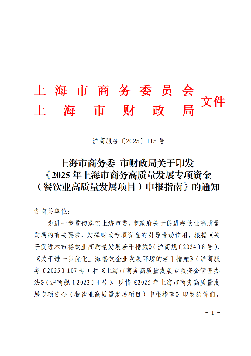 ??為進(jìn)一步貫徹落實(shí)上海市委、市政府關(guān)于促進(jìn)餐飲業(yè)高質(zhì)量發(fā)展的有關(guān)要求,發(fā)揮財(cái)政專項(xiàng)資金的引導(dǎo)帶動(dòng)作用,根據(jù)《關(guān)于促進(jìn)本市餐飲業(yè)高質(zhì)量發(fā)展若干措施》(滬商規(guī)〔2024〕8號(hào))、《關(guān)于進(jìn)一步優(yōu)化上海餐飲企業(yè)發(fā)展環(huán)境的若干措施》(滬商服務(wù)〔2025〕107號(hào))和《上海市商務(wù)高質(zhì)量發(fā)展專項(xiàng)資金管理辦法》(滬商規(guī)〔2022〕4號(hào)),現(xiàn)將《2025年上海市商務(wù)高質(zhì)量發(fā)展專項(xiàng)資金(餐飲業(yè)高質(zhì)量發(fā)展項(xiàng)目)申報(bào)指南》印發(fā)給你們,請(qǐng)按照要求做好相關(guān)申報(bào)工作。