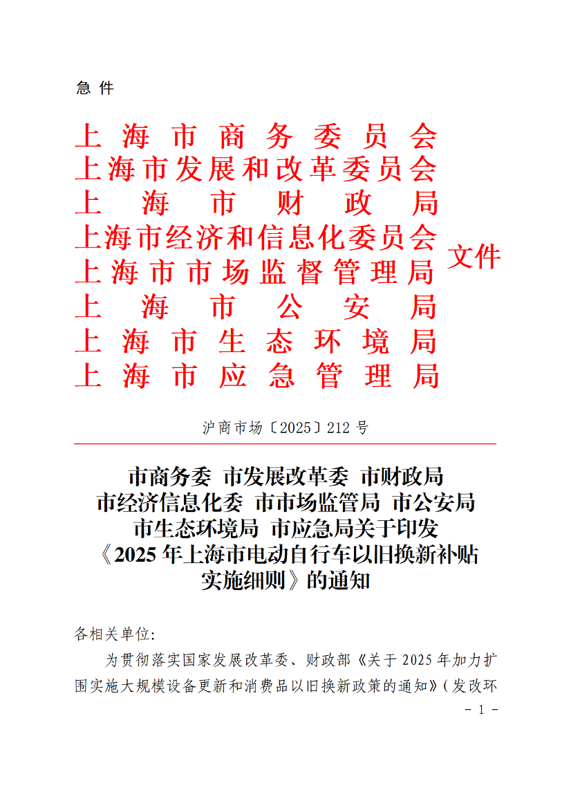 ??為貫徹落實(shí)國(guó)家發(fā)展改革委、財(cái)政部《關(guān)于2025年加力擴(kuò)圍實(shí)施大規(guī)模設(shè)備更新和消費(fèi)品以舊換新政策的通知》(發(fā)改環(huán)資〔2025〕13號(hào))、《商務(wù)部等5部門辦公廳(室)關(guān)于做好2025年度電動(dòng)自行車以舊換新工作的通知》(商辦流通函〔2025〕10號(hào))、《上海市關(guān)于2025年加力擴(kuò)圍推進(jìn)大規(guī)模設(shè)備更新和消費(fèi)品以舊換新工作的實(shí)施方案》(滬發(fā)改環(huán)資〔2025〕21號(hào))等工作要求,現(xiàn)印發(fā)《2025年上海市電動(dòng)自行車以舊換新補(bǔ)貼實(shí)施細(xì)則》,請(qǐng)認(rèn)真貫徹執(zhí)行。