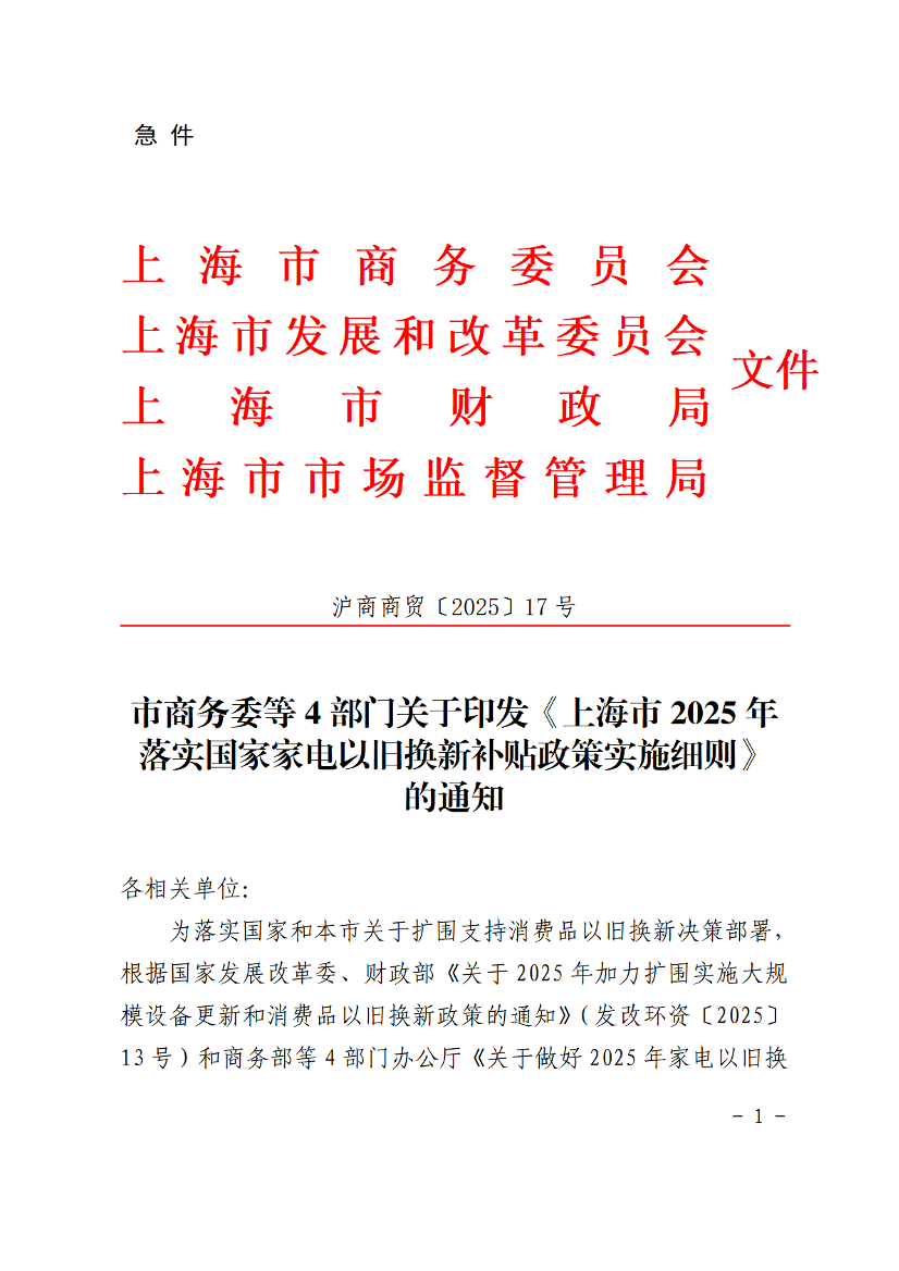 ??為落實國家和本市關于擴圍支持消費品以舊換新決策部署,根據國家發(fā)展改革委、財政部《關于2025年加力擴圍實施大規(guī)模設備更新和消費品以舊換新政策的通知》(發(fā)改環(huán)資〔2025〕13號)和商務部等4部門辦公廳《關于做好2025年家電以舊換新工作的通知》(商辦流通函〔2025〕6號)要求,現(xiàn)印發(fā)《上海市2025年落實國家家電以舊換新補貼政策實施細則》,請認真貫徹執(zhí)行。