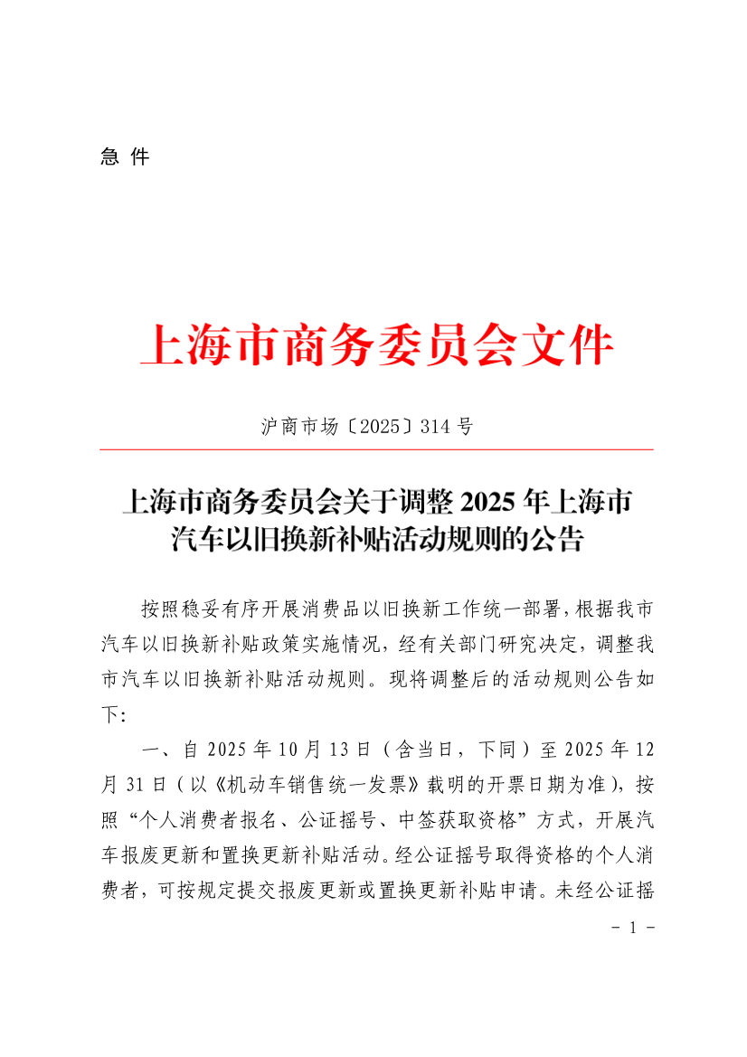 ??本公告未規(guī)定事項(xiàng),仍按《2025年上海市落實(shí)國家汽車報(bào)廢更新補(bǔ)貼政策實(shí)施細(xì)則》(滬商市場(chǎng)〔2025〕20號(hào))、《2025年上海市汽車置換更新補(bǔ)貼政策實(shí)施細(xì)則》(滬商市場(chǎng)〔2025〕21號(hào))及《2025年上海市進(jìn)一步支持汽車置換更新補(bǔ)貼政策實(shí)施細(xì)則》(滬商市場(chǎng)〔2025〕284號(hào))的有關(guān)規(guī)定執(zhí)行。本公告由上海市商務(wù)委員會(huì)負(fù)責(zé)解釋。