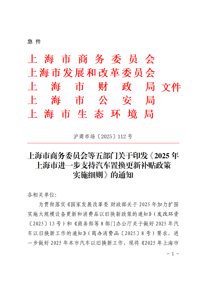 ??為貫徹落實(shí)《國(guó)家發(fā)展改革委 財(cái)政部關(guān)于2025年加力擴(kuò)圍實(shí)施大規(guī)模設(shè)備更新和消費(fèi)品以舊換新政策的通知》(發(fā)改環(huán)資〔2025〕13號(hào))和《商務(wù)部等8部門辦公廳關(guān)于做好2025年汽車以舊換新工作的通知》(商辦消費(fèi)函〔2025〕8號(hào))要求,進(jìn)一步做好2025年本市汽車以舊換新工作,現(xiàn)將《2025年上海市進(jìn)一步支持汽車置換更新補(bǔ)貼政策實(shí)施細(xì)則》印發(fā)給你們,請(qǐng)認(rèn)真按照?qǐng)?zhí)行。