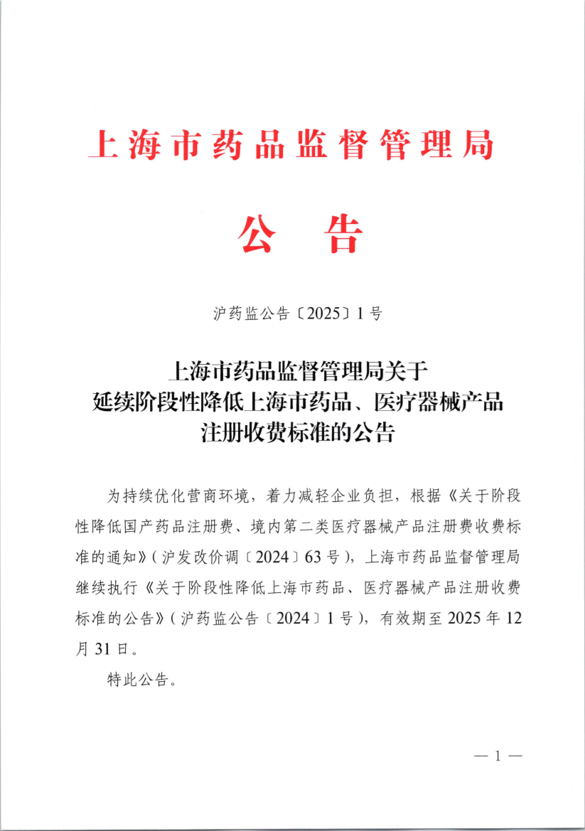 ??為持續(xù)優(yōu)化營商環(huán)境,著力減輕企業(yè)負(fù)擔(dān),根據(jù)《關(guān)于階段性降低國產(chǎn)藥品注冊費(fèi)、境內(nèi)第二類醫(yī)療器械產(chǎn)品注冊費(fèi)收費(fèi)標(biāo)準(zhǔn)的通知》(滬發(fā)改價(jià)調(diào)﹝2024﹞63號),上海市藥品監(jiān)督管理局繼續(xù)執(zhí)行《關(guān)于階段性降低上海市藥品、醫(yī)療器械產(chǎn)品注冊收費(fèi)標(biāo)準(zhǔn)的公告》(滬藥監(jiān)公告﹝2024﹞1號),有效期至2025年12月31日。