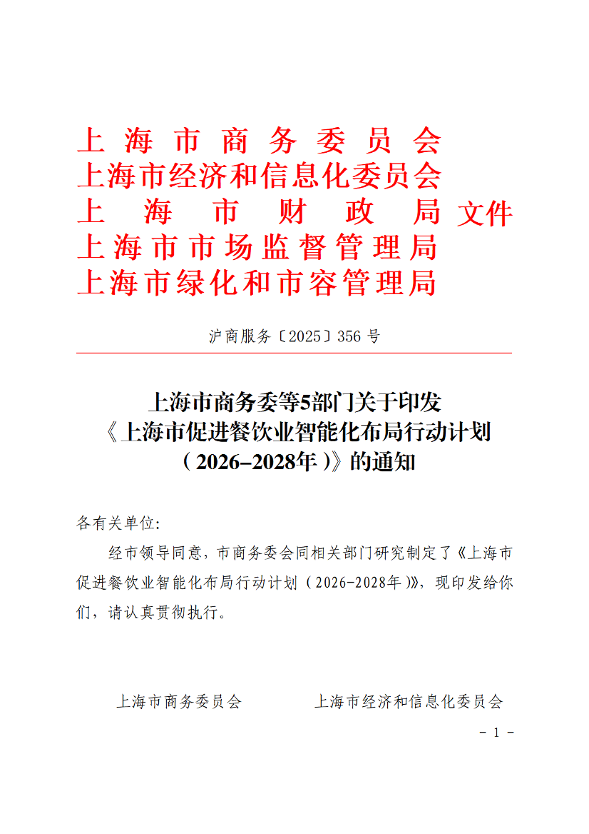??經(jīng)市領(lǐng)導(dǎo)同意,市商務(wù)委會(huì)同相關(guān)部門研究制定了《上海市促進(jìn)餐飲業(yè)智能化布局行動(dòng)計(jì)劃(2026-2028年)》,現(xiàn)印發(fā)給你們,請(qǐng)認(rèn)真貫徹執(zhí)行。