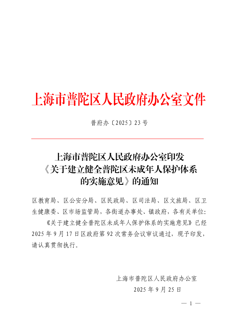 ??《關(guān)于建立健全普陀區(qū)未成年人保護(hù)體系的實(shí)施意見》已經(jīng)2025年9月17日區(qū)政府第92次常務(wù)會(huì)議審議通過,現(xiàn)予印發(fā),請(qǐng)認(rèn)真貫徹執(zhí)行。