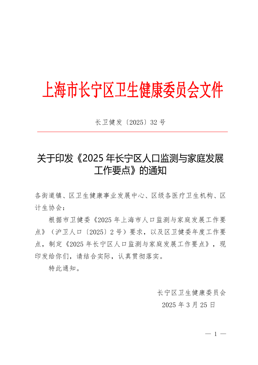 ??根據(jù)市衛(wèi)健委《2025年上海市人口監(jiān)測與家庭發(fā)展工作要點》(滬衛(wèi)人口〔2025〕2號)要求,以及區(qū)衛(wèi)健委年度工作要點,制定《2025年長寧區(qū)人口監(jiān)測與家庭發(fā)展工作要點》,現(xiàn)印發(fā)給你們,請結(jié)合實際,認真貫徹落實。