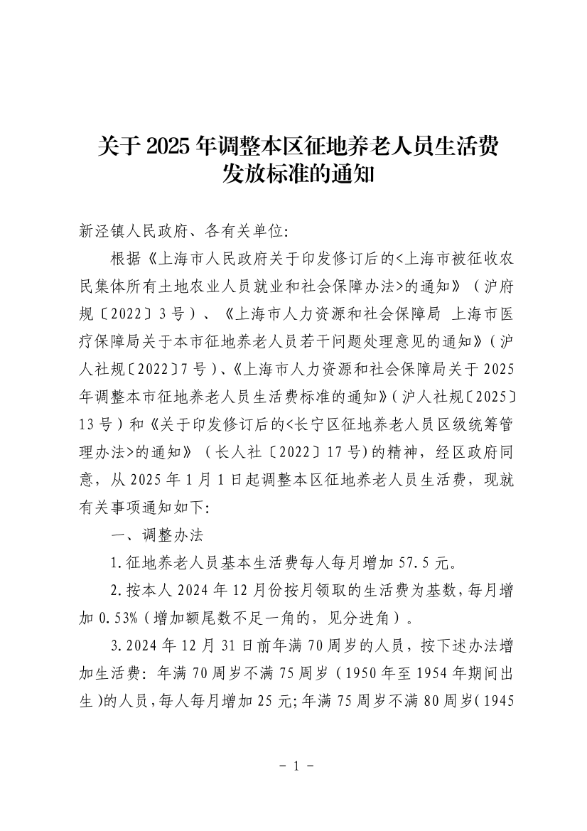 ??根據(jù)《上海市人民政府關于印發(fā)修訂后的<上海市被征收農民集體所有土地農業(yè)人員就業(yè)和社會保障辦法>的通知》(滬府規(guī)〔2022〕3號)、《上海市人力資源和社會保障局 上海市醫(yī)療保障局關于本市征地養(yǎng)老人員若干問題處理意見的通知》(滬人社規(guī)〔2022〕7號)、《上海市人力資源和社會保障局關于2025年調整本市征地養(yǎng)老人員生活費標準的通知》(滬人社規(guī)〔2025〕13號)和《關于印發(fā)修訂后的<長寧區(qū)征地養(yǎng)老人員區(qū)級統(tǒng)籌管理辦法>的通知》(長人社〔2022〕17號)的精神,經區(qū)政府同意,從2025年1月1日起調整本區(qū)征地養(yǎng)老人員生活費,現(xiàn)就有關事項通知如下: