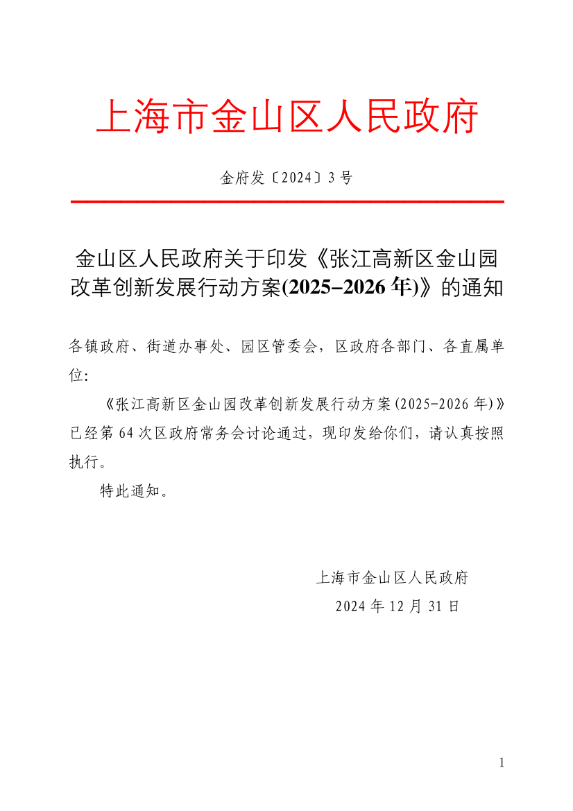 ??《張江高新區(qū)金山園改革創(chuàng)新發(fā)展行動(dòng)方案(2025-2026年)》已經(jīng)第64次區(qū)政府常務(wù)會(huì)討論通過,現(xiàn)印發(fā)給你們,請認(rèn)真按照執(zhí)行。