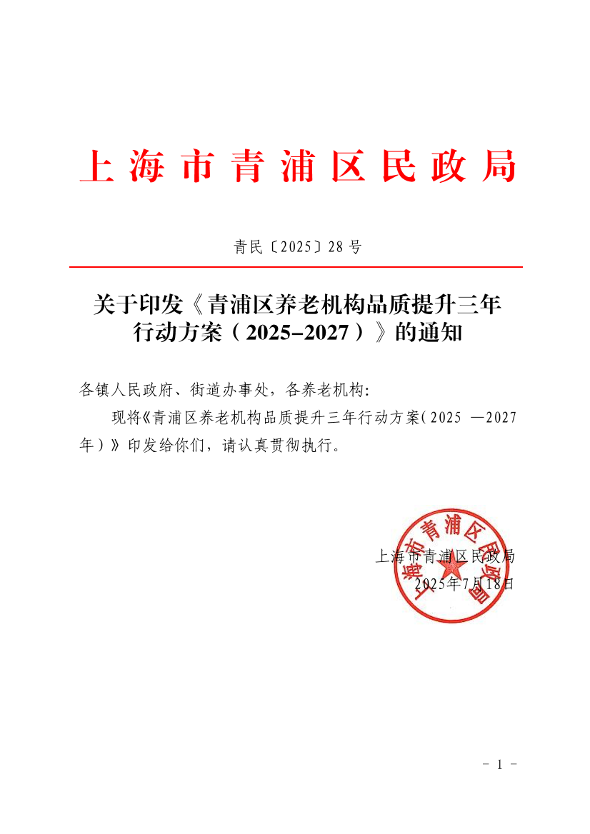 ??現(xiàn)將《青浦區(qū)養(yǎng)老機(jī)構(gòu)品質(zhì)提升三年行動(dòng)方案(2025 —2027年)》印發(fā)給你們,請(qǐng)認(rèn)真貫徹執(zhí)行。