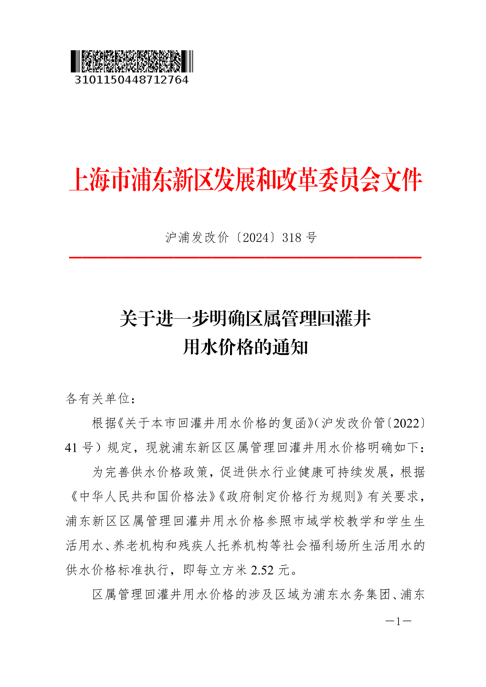 ??為完善供水價(jià)格政策,促進(jìn)供水行業(yè)健康可持續(xù)發(fā)展,根據(jù)《中華人民共和國(guó)價(jià)格法》《政府制定價(jià)格行為規(guī)則》有關(guān)要求,浦東新區(qū)區(qū)屬管理回灌井用水價(jià)格參照市域?qū)W校教學(xué)和學(xué)生生活用水、養(yǎng)老機(jī)構(gòu)和殘疾人托養(yǎng)機(jī)構(gòu)等社會(huì)福利場(chǎng)所生活用水的供水價(jià)格標(biāo)準(zhǔn)執(zhí)行,即每立方米2.52元。