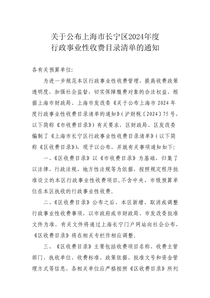 ??為進(jìn)一步規(guī)范本區(qū)行政事業(yè)性收費(fèi)管理,提高收費(fèi)政策透明度,加強(qiáng)社會監(jiān)督,切實保障繳費(fèi)對象的合法權(quán)益,根據(jù)上海市財政局、上海市發(fā)改委《關(guān)于公布上海市2024年度行政事業(yè)性收費(fèi)目錄清單的通知》(滬財稅〔2024〕75號,以下簡稱《市收費(fèi)目錄》)有關(guān)要求,區(qū)財政局、區(qū)發(fā)改委編制了《上海市長寧區(qū)行政事業(yè)性收費(fèi)目錄清單》(以下簡稱《區(qū)收費(fèi)目錄》),現(xiàn)予以公布,并就有關(guān)事項通知如下: