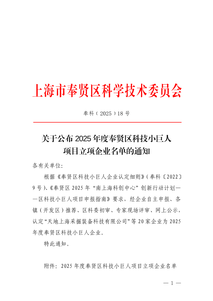 ??根據(jù)《奉賢區(qū)科技小巨人企業(yè)認(rèn)定細(xì)則》(奉科〔2022〕9號(hào))、《奉賢區(qū)2025年“南上??苿?chuàng)中心”創(chuàng)新行動(dòng)計(jì)劃——區(qū)科技小巨人項(xiàng)目申報(bào)指南》要求,經(jīng)企業(yè)自主申報(bào)、各鎮(zhèn)(開發(fā)區(qū))推薦、區(qū)科委初審、專家現(xiàn)場(chǎng)評(píng)審、網(wǎng)上公示,認(rèn)定“天地上海采掘裝備科技有限公司”等20家企業(yè)為2025年度奉賢區(qū)科技小巨人企業(yè)。