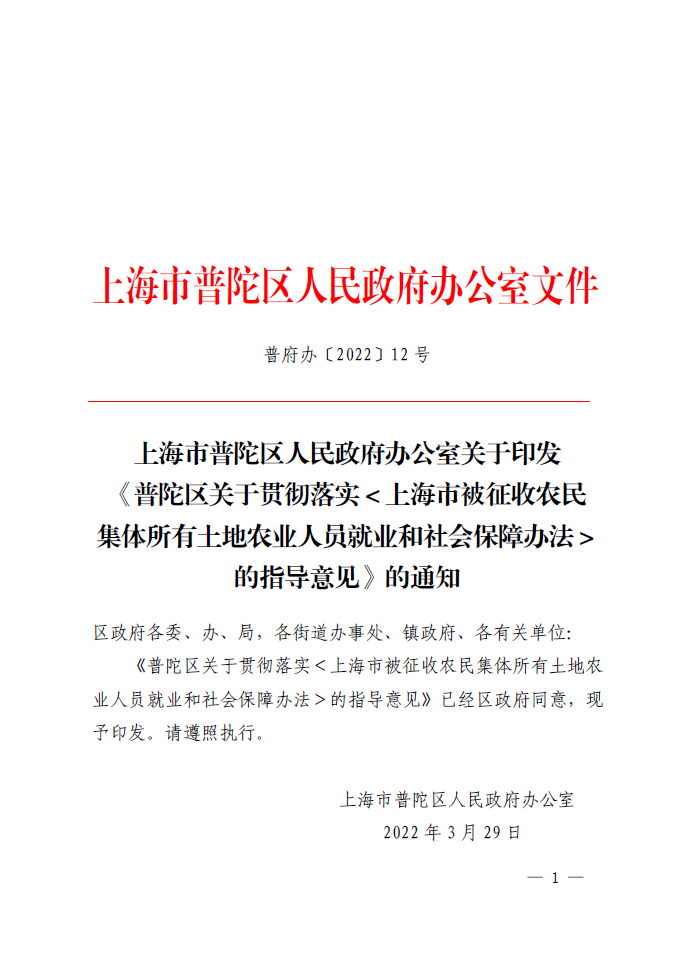 普陀區(qū)關(guān)于貫徹落實(shí)《上海市被征收農(nóng)民集體所有土地農(nóng)業(yè)人員就業(yè)和社會(huì)保障辦法》的指導(dǎo)意見