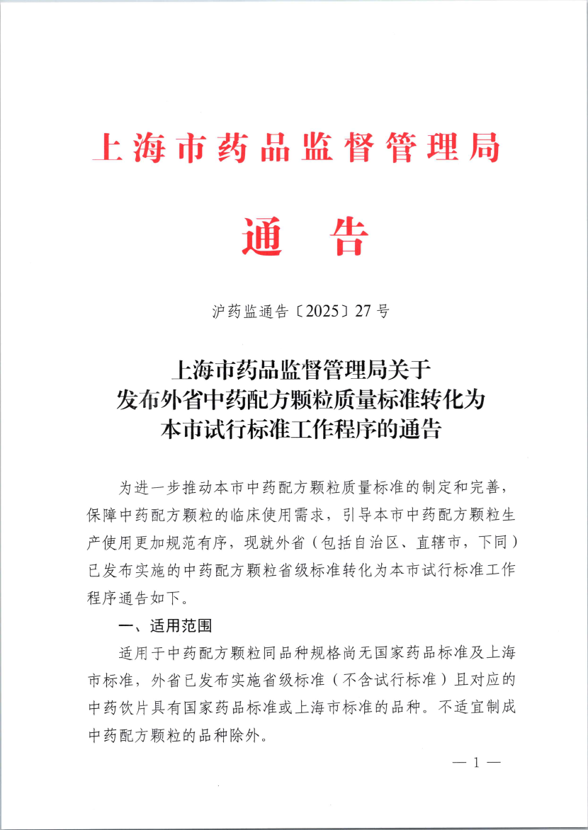 ??為進一步推動本市中藥配方顆粒質(zhì)量標準的制定和完善,保障中藥配方顆粒的臨床使用需求,引導本市中藥配方顆粒生產(chǎn)使用更加規(guī)范有序,現(xiàn)就外?。òㄗ灾螀^(qū)、直轄市,下同)已發(fā)布實施的中藥配方顆粒省級標準轉化為本市試行標準工作程序通告如下。