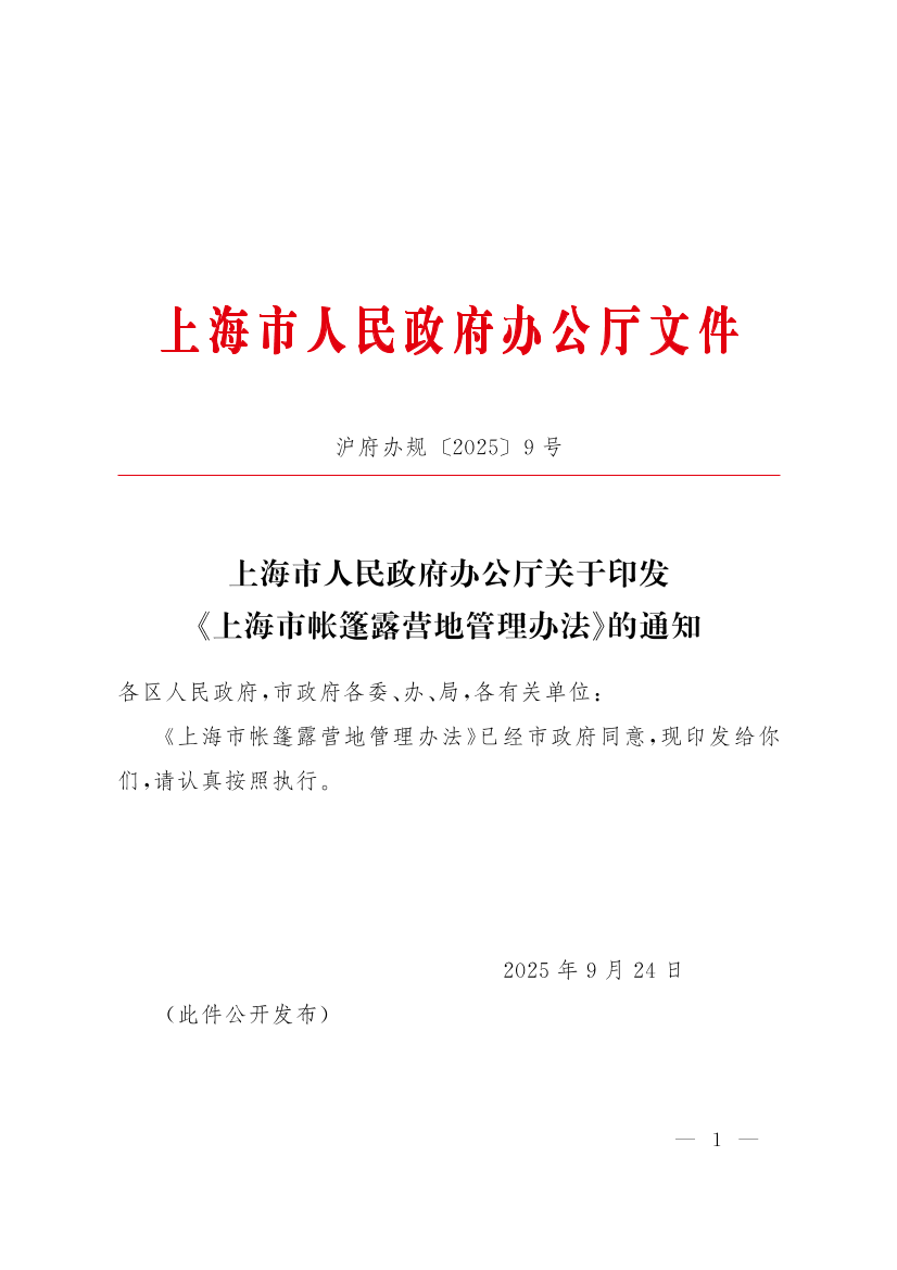 上海市人民政府辦公廳關(guān)于印發(fā)《上海市帳篷露營(yíng)地管理辦法》的通知
