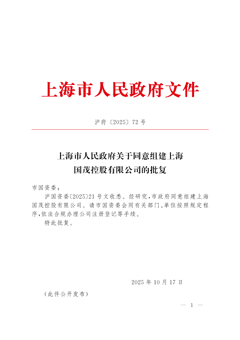 ??滬國資委〔2025〕21號文收悉。經(jīng)研究,市政府同意組建上海國茂控股有限公司。請市國資委會同有關(guān)部門、單位按照規(guī)定程序,依法合規(guī)辦理公司注冊登記等手續(xù)。