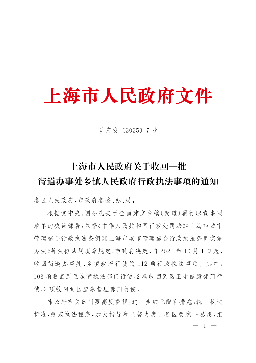 ??根據黨中央、國務院關于全面建立鄉(xiāng)鎮(zhèn)(街道)履行職責事項清單的決策部署,依據《中華人民共和國行政處罰法》《上海市城市管理綜合行政執(zhí)法條例》《上海市城市管理綜合行政執(zhí)法條例實施辦法》等法律法規(guī)規(guī)章規(guī)定,市政府決定,自2025年10月1日起,收回街道辦事處、鄉(xiāng)鎮(zhèn)政府行使的112項行政執(zhí)法事項。其中,108項收回到區(qū)城管執(zhí)法部門行使,2項收回到區(qū)衛(wèi)生健康部門行使,2項收回到區(qū)應急管理部門行使。