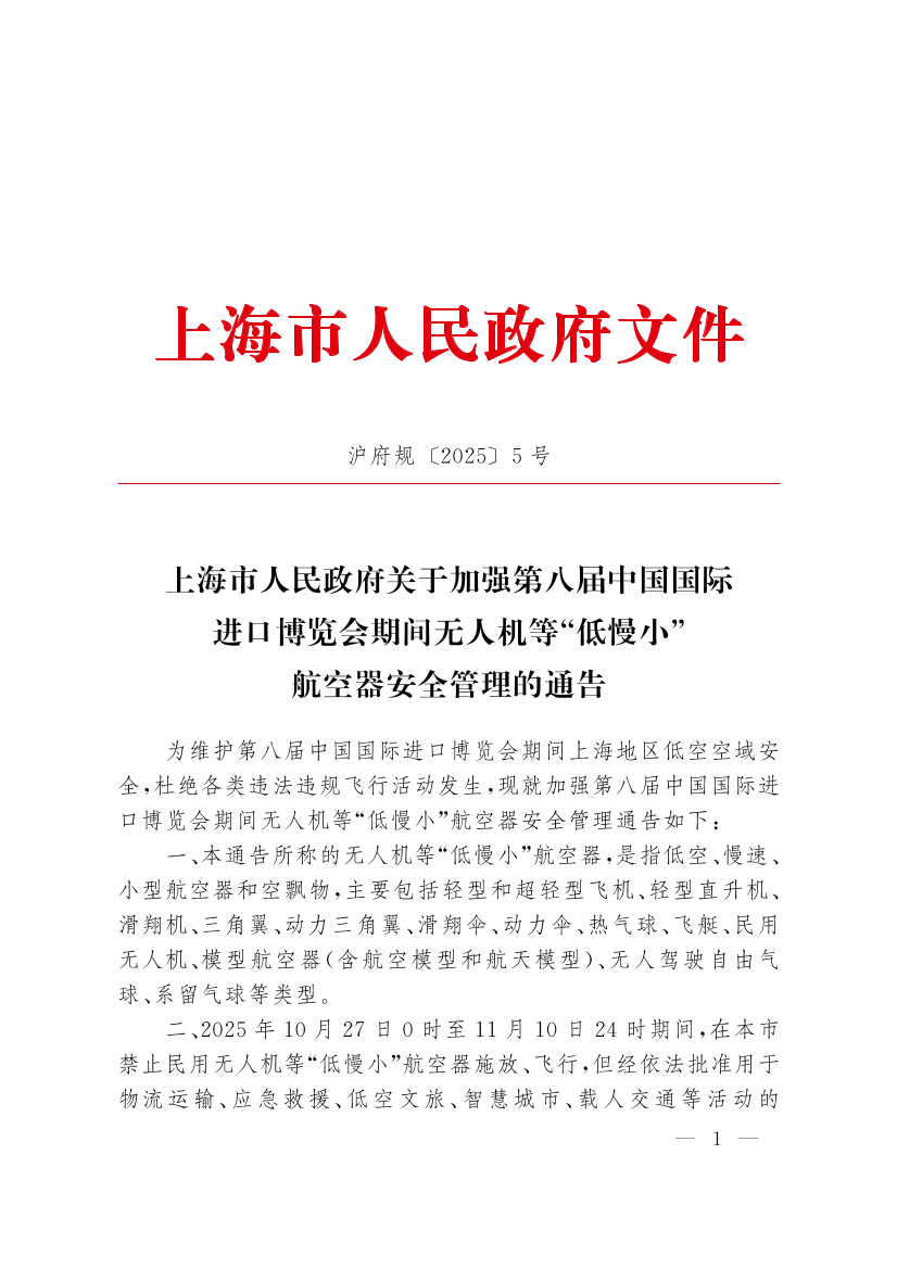 ??為維護(hù)第八屆中國國際進(jìn)口博覽會期間上海地區(qū)低空空域安全,杜絕各類違法違規(guī)飛行活動(dòng)發(fā)生,現(xiàn)就加強(qiáng)第八屆中國國際進(jìn)口博覽會期間無人機(jī)等“低慢小”航空器安全管理通告如下: