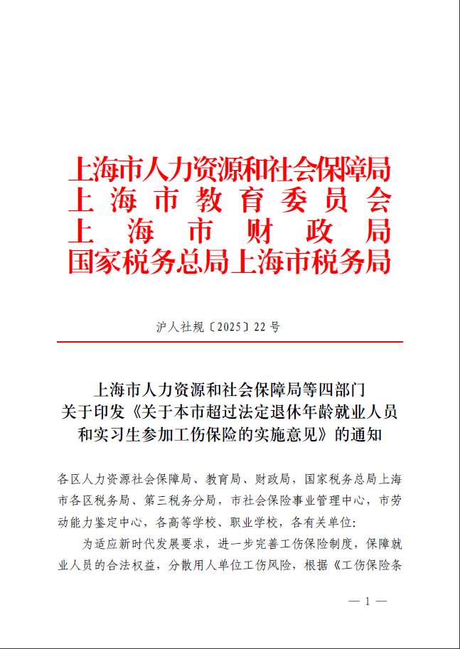 ??為適應(yīng)新時(shí)代發(fā)展要求,進(jìn)一步完善工傷保險(xiǎn)制度,保障就業(yè)人員的合法權(quán)益,分散用人單位工傷風(fēng)險(xiǎn),根據(jù)《工傷保險(xiǎn)條例》《上海市工傷保險(xiǎn)實(shí)施辦法》,結(jié)合本市實(shí)際,現(xiàn)就本市超過(guò)法定退休年齡就業(yè)人員(以下簡(jiǎn)稱“超齡就業(yè)人員”)和實(shí)習(xí)生參加工傷保險(xiǎn)提出實(shí)施意見(jiàn),現(xiàn)印發(fā)給你們,請(qǐng)遵照?qǐng)?zhí)行。