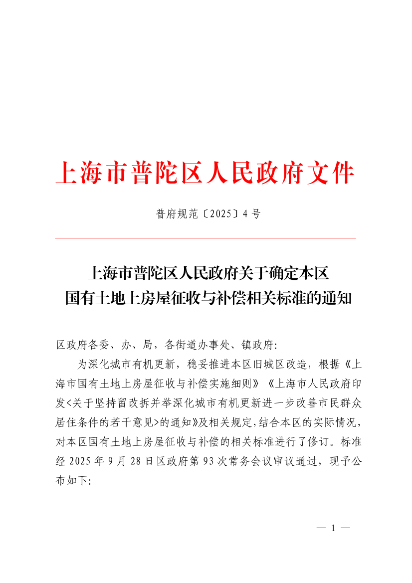 ??為深化城市有機更新,穩(wěn)妥推進本區(qū)舊城區(qū)改造,根據(jù)《上海市國有土地上房屋征收與補償實施細則》《上海市人民政府印發(fā)<關(guān)于堅持留改拆并舉深化城市有機更新進一步改善市民群眾居住條件的若干意見>的通知》及相關(guān)規(guī)定,結(jié)合本區(qū)的實際情況,對本區(qū)國有土地上房屋征收與補償?shù)南嚓P(guān)標準進行了修訂。標準經(jīng)2025年9月28日區(qū)政府第93次常務(wù)會議審議通過,現(xiàn)予公布如下: