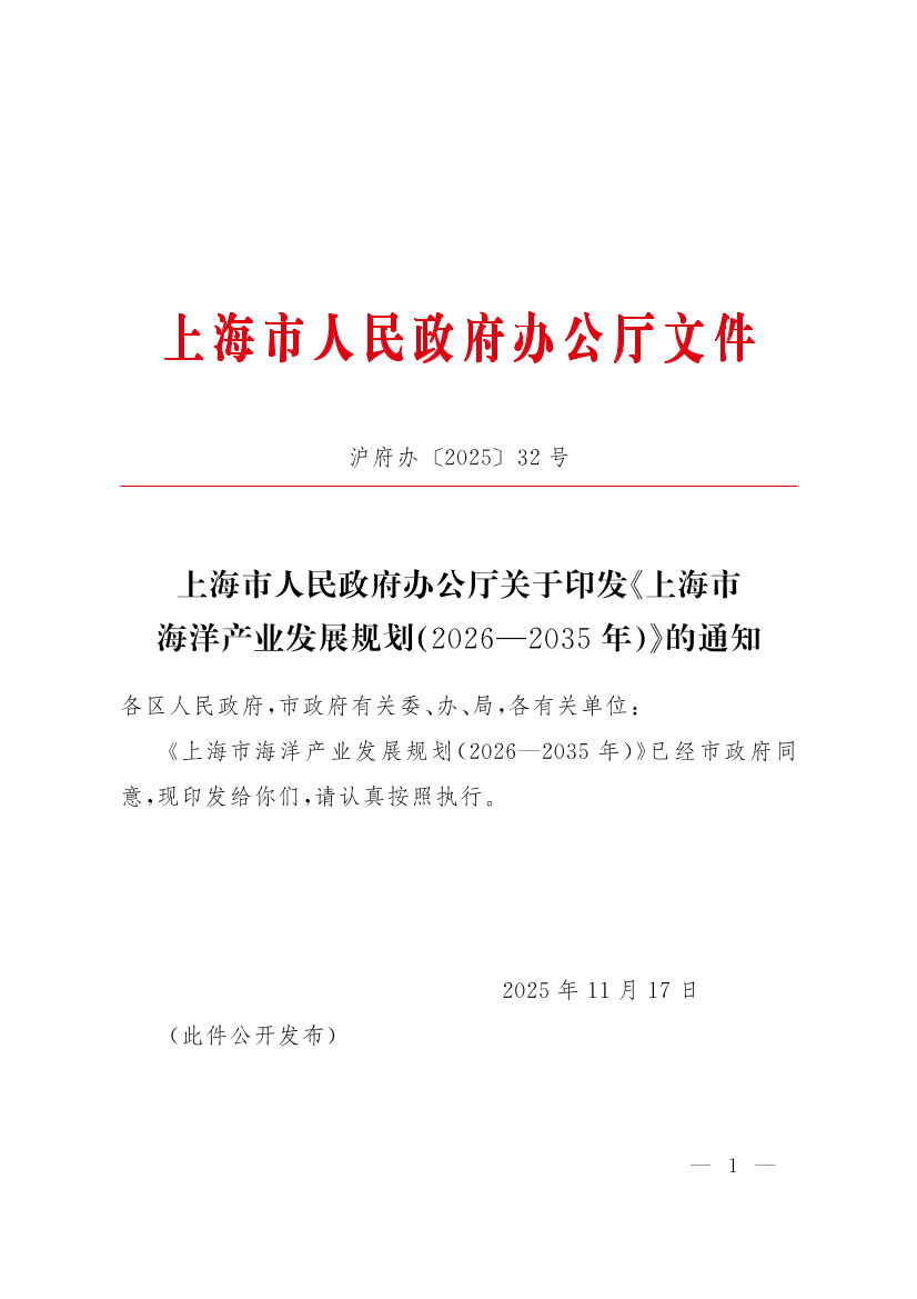 ??《上海市海洋產(chǎn)業(yè)發(fā)展規(guī)劃(2026—2035年)》已經(jīng)市政府同意,現(xiàn)印發(fā)給你們,請認(rèn)真按照執(zhí)行。