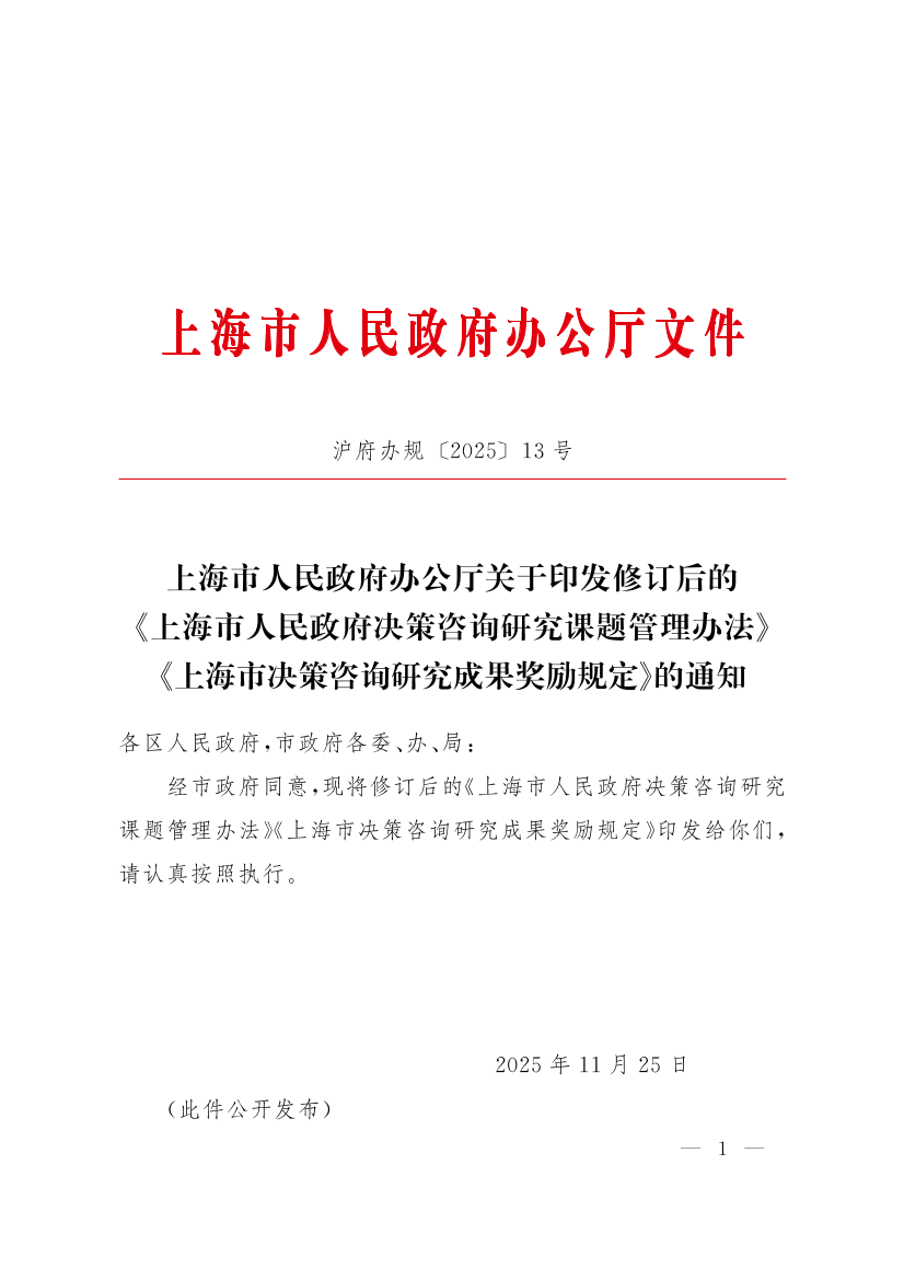 上海市人民政府辦公廳關于印發(fā)修訂后的《上海市人民政府決策咨詢研究課題管理辦法》《上海市決策咨詢研究成果獎勵規(guī)定》的通知