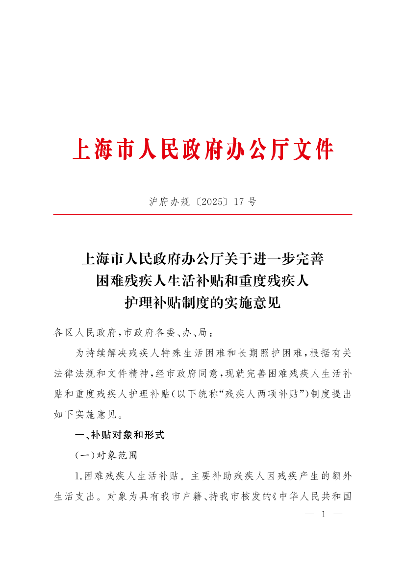 上海市人民政府辦公廳關(guān)于進(jìn)一步完善困難殘疾人生活補(bǔ)貼和重度殘疾人護(hù)理補(bǔ)貼制度的實(shí)施意見