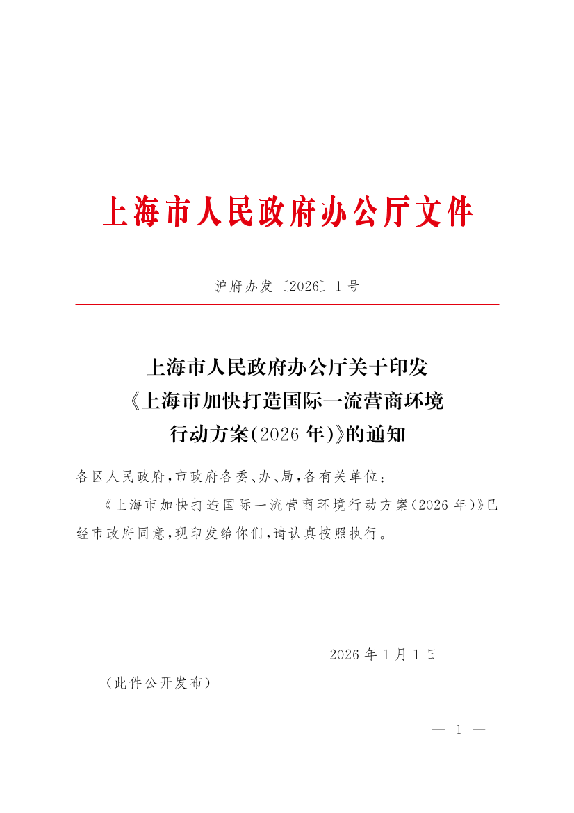 上海市人民政府辦公廳關(guān)于印發(fā)《上海市加快打造國際一流營商環(huán)境行動方案(2026年)》的通知