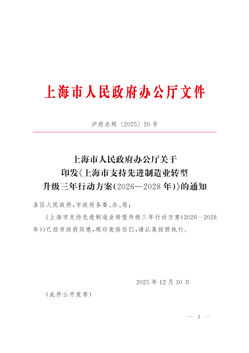 ??《上海市支持先進(jìn)制造業(yè)轉(zhuǎn)型升級(jí)三年行動(dòng)方案(2026—2028年)》已經(jīng)市政府同意,現(xiàn)印發(fā)給你們,請(qǐng)認(rèn)真按照?qǐng)?zhí)行。