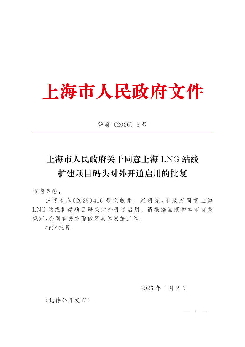 ??滬商水岸〔2025〕416號文收悉。經(jīng)研究,市政府同意上海LNG站線擴建項目碼頭對外開通啟用。請根據(jù)國家和本市有關規(guī)定,會同有關方面做好具體實施工作。