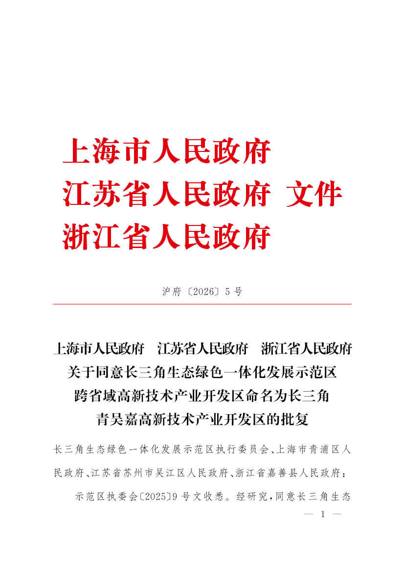 ??示范區(qū)執(zhí)委會(huì)〔2025〕9號(hào)文收悉。經(jīng)研究,同意長三角生態(tài)綠色一體化發(fā)展示范區(qū)跨省域高新技術(shù)產(chǎn)業(yè)開發(fā)區(qū)命名為長三角青吳嘉高新技術(shù)產(chǎn)業(yè)開發(fā)區(qū)。