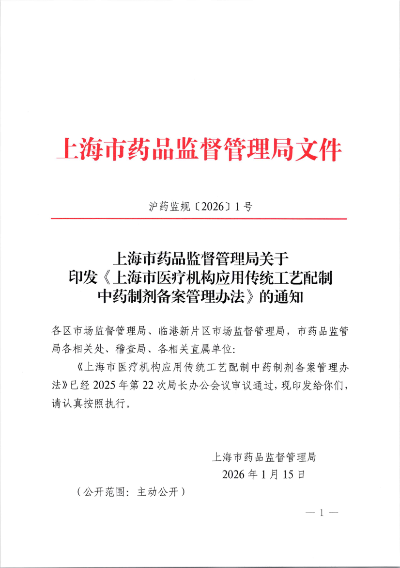 ??《上海市醫(yī)療機構(gòu)應(yīng)用傳統(tǒng)工藝配制中藥制劑備案管理辦法》已經(jīng)2025年第22次局長辦公會議審議通過,現(xiàn)印發(fā)給你們,請認真按照執(zhí)行。